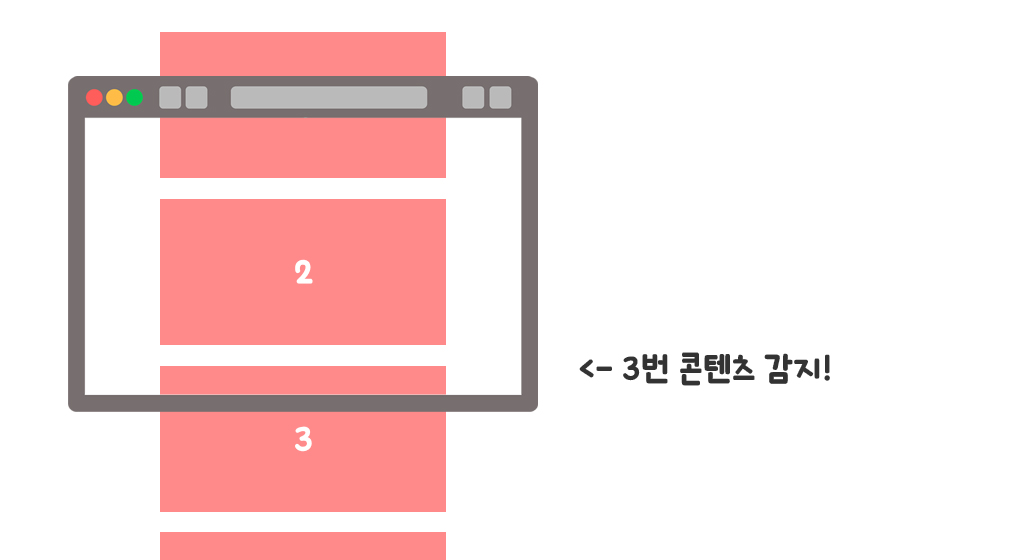- threshold: 관찰 대상이 화면 내에 얼마나 들어 왔을 때 콜백 함수를 호출할 지 결정하는 값으로써 기본값은 0(0%)입니다. 최대 1(100%)까지 지정 가능하며, 0.6이라 하면 대상이 화면에 60% 이상 보이기 시작할 때 콜백 함수를 호출합니다.