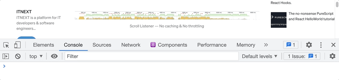 최적화를 하지 않았다면, 위 그림처럼 스크롤할 때마다 이벤트가 계속해서 발생했을 겁니다. 하지만 scroll 이벤트와 달리 교차 관찰자는 메인 스레드와 별개로 비동기적으로 실행되기 때문에, 별도의 최적화가 없더라도 기본적으로 훨씬 빠른 퍼포먼스를 보여 줍니다.