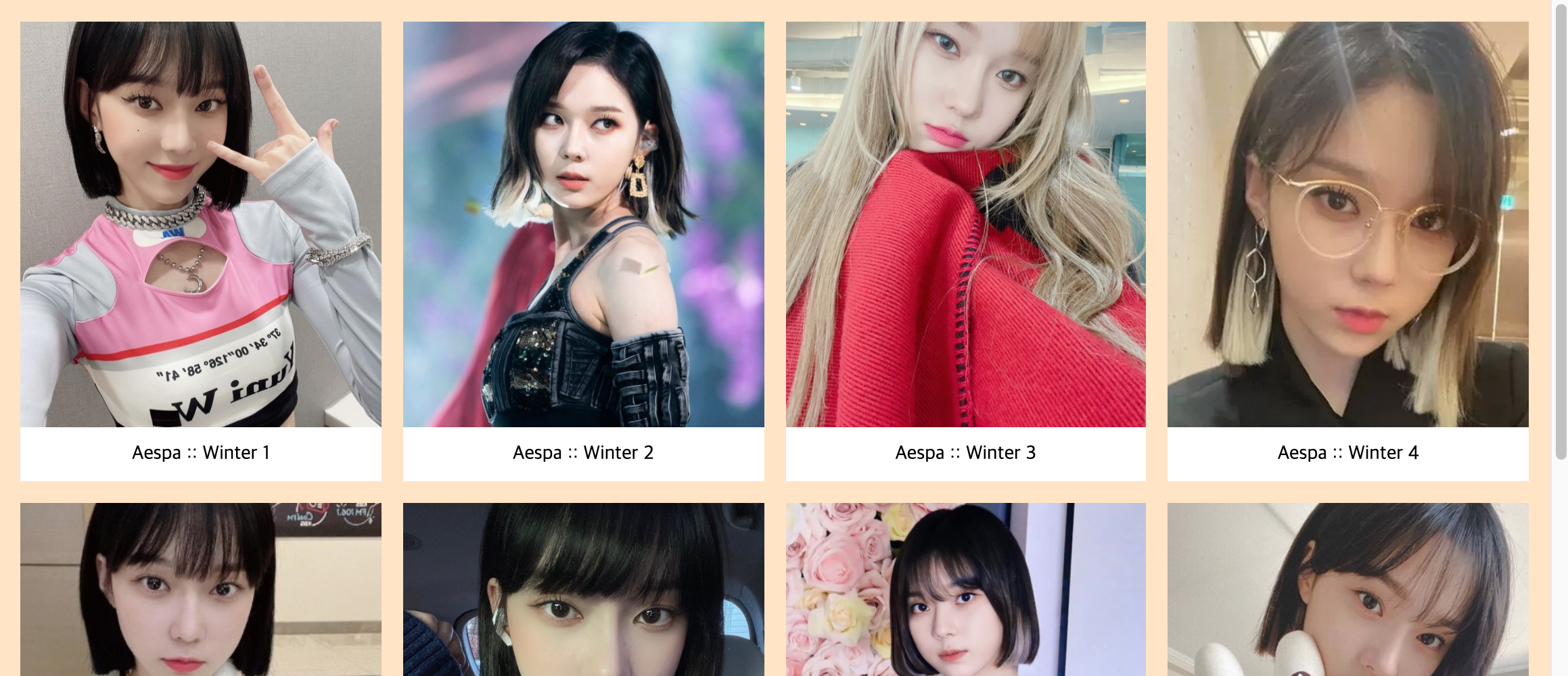 그나저나 예제를 만들면서도 들었고, 이렇게 글을 쓰면서도 드는 생각이지만 윈터 정말 예쁘네요. 나중에 사이드 프로젝트 주제로 에스파 팬페이지를 만들어 볼 수도..? 💦
