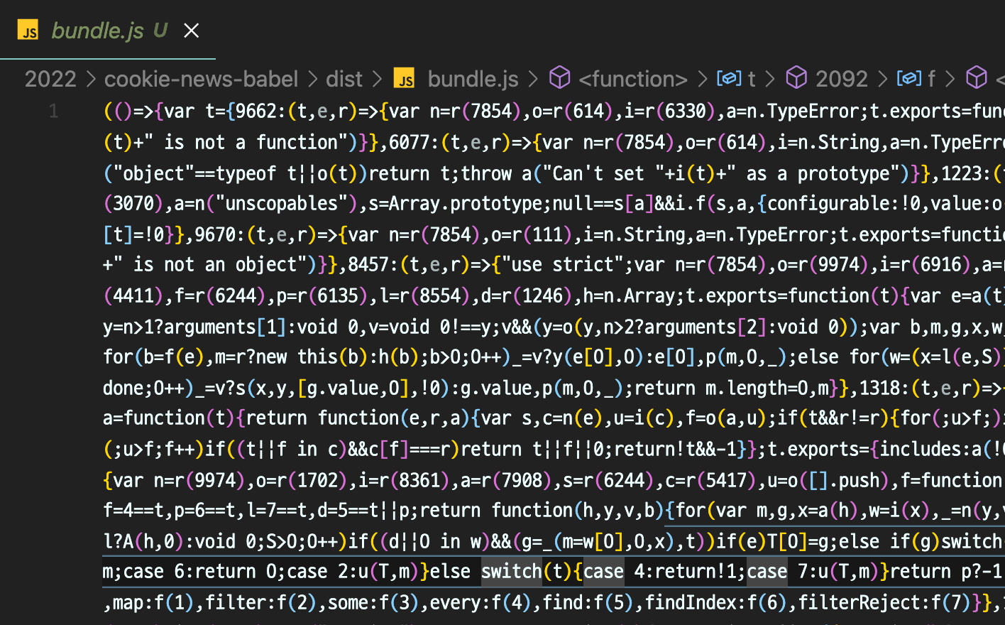 빌드 중 오류가 발생하지 않았다면, 번들링 된 결과물이 정상적으로 dist 디렉토리 안에 생겼을 겁니다. 그리고 만들어진 스크립트 파일을 열어보면 알아보기 힘든 이상한 코드들이 잔뜩 쓰여있는 것도 확인할 수 있습니다.