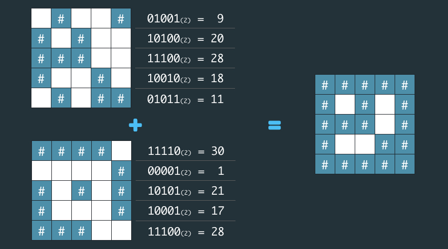 - 암호화된 배열은 지도의 각 가로줄에서 벽 부분을 1, 공백 부분을 0으로 부호화했을 때 얻어지는 이진수에 해당하는 값의 배열이다.