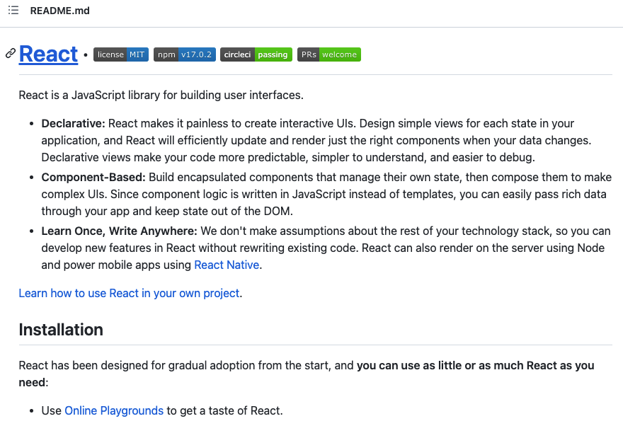 잘 작성된 README 문서의 예시로 facebook React 저장소를 가져와 봤습니다. 링크를 타고 들어가 보면 사진 속 내용 외에도 더 많은 내용을 확인할 수 있는데, React 뿐만 아니라 깃허브에 등록되어 있는 대부분의 프로젝트들은 개발자들이 README 문서 작성을 꼼꼼하게 해 두는 편입니다.