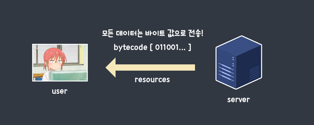 네트워크를 통해 오고 가는 데이터는 기본적으로 모두 0과 1로 이루어진 바이트코드(Bytecode) 문서입니다. 그렇기 때문에 응답 받은 HTML 문서는 텍스트로 변환하는 과정이 필요한데, 이는 서버가 문서를 보내줄 때 헤더를 통해 어떤 문자셋(UTF-8, EUC-KR 등)으로 변환해야 하는지 알려주므로 걱정하지 않아도 됩니다. HTML 문서가 텍스트로 변환된 후에는 렌더링 엔진이 코드를 위에서부터 아래로 읽어 나가며, 필요한 리소스를 추가로 요청합니다.