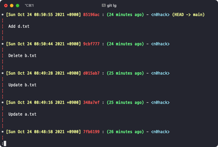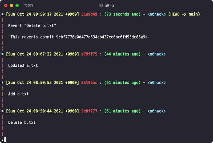 위에서부터 로그를 보면 2번째 커밋에서 b.txt라는 파일이 삭제되었습니다. 그런데 저는 b.txt 파일이 삭제되기 전으로 되돌아가고 싶어졌습니다. 이런 경우 git reset <hash> 형태의 명령을 실행하면 되는데, b.txt 파일이 존재하던 시점은 Update b.txt 커밋 메시지가 적힌 직후의 시점이니 이 hash값 d015ab7을 복사해야 합니다.